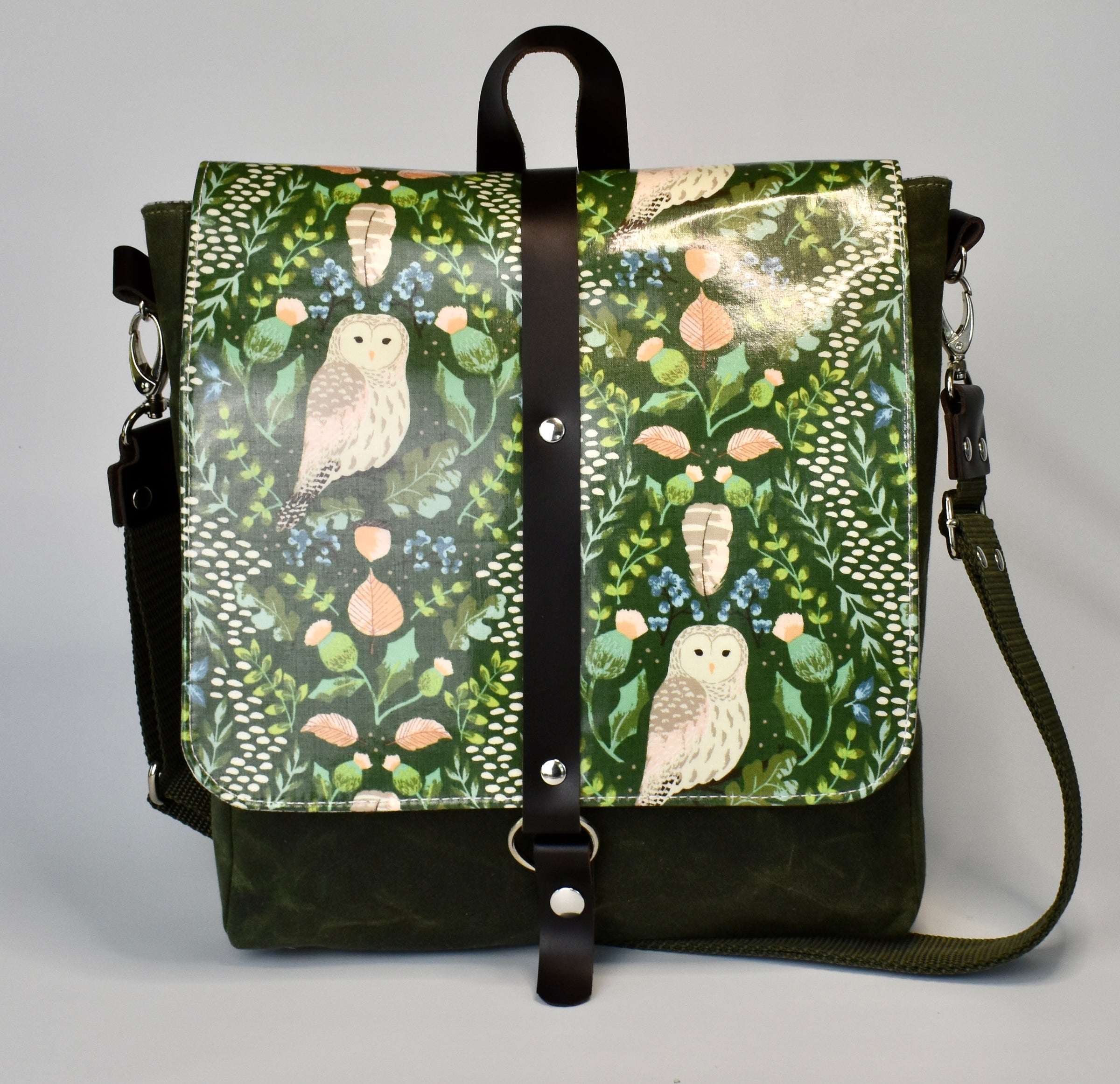 Convertible cross-body/backpack messenger in durable waxed canvas! Features snap closure for safety, adjustable, removable strap can be worn cross body or over the shoulder - quick release hooks on the strap makes it simple to convert to backpack. Just unhook one side and slip through the grab strap to create backpack straps. Two exterior pockets on the front and zippered pocket across the exterior back. Interior has two slip pockets. Bag measures 11" tall x 10" wide x 2" deep